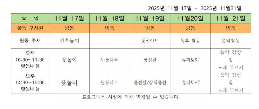 2025.11.17 ( 11월 3주 차 주간프로그램) 페이지 정보 작성자 사회복지사 댓글 0건 조회 77회 작성일 25-11-18 09:48 목록 본문 2025.11.17 이전글2025.11.22 ( 11월 4주 차 주간프로그램 ) 25.11.22 다음글2025.11.11 ( 11월 2주 차 주간 프로그램 ) 25.11.11