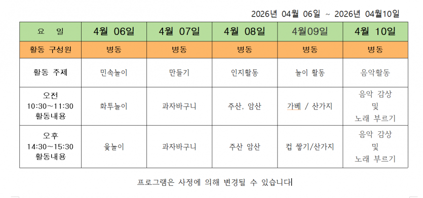 2026.04.07 ( 4월 2주 차 주간프로그램 ) 페이지 정보 작성자 사회복지사 댓글 0건 조회 1회 작성일 26-04-07 17:45 목록 본문 2026.04.07 다음글2026.03.23 ( 3월 4째 주 주간프로그램 ) 26.03.23