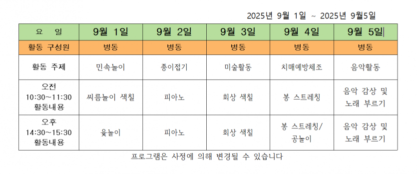 2025.09.01 ( 9월 첫째 주간 프로그램 ) 페이지 정보 작성자 사회복지사 댓글 0건 조회 142회 작성일 25-09-01 17:46 목록 본문 2025.09.01 이전글2025.09.08 ( 9월 2주 차 주간 프로그램 ) 25.09.09 다음글2025.08.024 ( 8월 4주 차 주간프로그램 ) 25.08.24