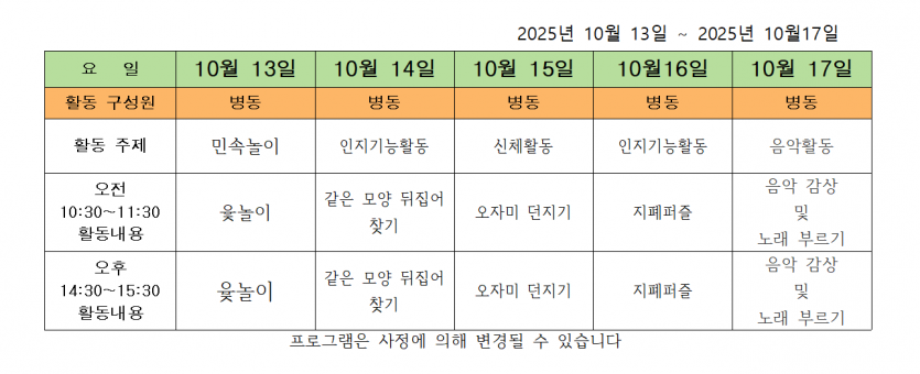 2025.10.08 ( 10월 2주 차 주간 프로그램 ) 페이지 정보 작성자 사회복지사 댓글 0건 조회 106회 작성일 25-10-08 14:31 목록 본문 2025.10.08 이전글2025.10.21 ( 10월 4주 차 주간 프로그램 ) 25.10.21 다음글2025.09.3-29 ( 4주 차 주간 프로그램 ) 25.09.30