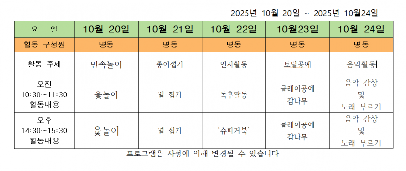2025.10.21 ( 10월 4주 차 주간 프로그램 ) 페이지 정보 작성자 사회복지사 댓글 0건 조회 93회 작성일 25-10-21 11:26 목록 본문 2025.10.21 이전글2025.10.28 ( 10 월 5주 차 주간 프로그램 ) 25.10.28 다음글2025.10.08 ( 10월 2주 차 주간 프로그램 ) 25.10.08