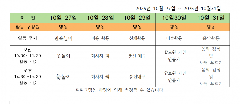 2025.10.28 ( 10 월 5주 차 주간 프로그램 ) 페이지 정보 작성자 사회복지사 댓글 0건 조회 87회 작성일 25-10-28 17:34 목록 본문 2025.10.28 이전글2025.11.03 ( 11월 첫째 주 주간 프로그램 ) 25.11.03 다음글2025.10.21 ( 10월 4주 차 주간 프로그램 ) 25.10.21