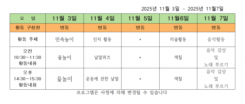 2025.11.03 ( 11월 첫째 주 주간 프로그램 ) 페이지 정보 작성자 사회복지사 댓글 0건 조회 91회 작성일 25-11-03 17:43 목록 본문 2025.11.03 이전글2025.11.11 ( 11월 2주 차 주간 프로그램 ) 25.11.11 다음글2025.10.28 ( 10 월 5주 차 주간 프로그램 ) 25.10.28
