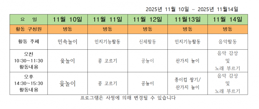 2025.11.11 ( 11월 2주 차 주간 프로그램 ) 페이지 정보 작성자 사회복지사 댓글 0건 조회 82회 작성일 25-11-11 17:38 목록 본문 2025.11.11 이전글2025.11.17 ( 11월 3주 차 주간프로그램) 25.11.18 다음글2025.11.03 ( 11월 첫째 주 주간 프로그램 ) 25.11.03