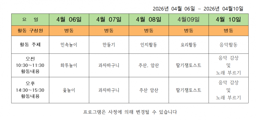 2026.04.07 ( 4월 2주 차 주간프로그램 ) 페이지 정보 작성자 사회복지사 댓글 0건 조회 3회 작성일 26-04-07 17:45 목록 본문 2026.04.07 다음글2026.03.23 ( 3월 4째 주 주간프로그램 ) 26.03.23