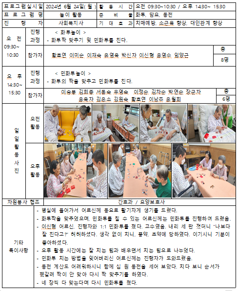 놀이 활동 페이지 정보 작성자 사회복지사 댓글 0건 조회 191회 작성일 24-06-24 17:54 목록 본문 2024.06.24 이전글주간 프로그램 24.06.24 다음글24.06.21 24.06.21