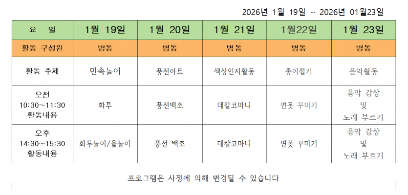 2026.01.19( 1월 4주 차 주간프로그램 ) 페이지 정보 작성자 사회복지사 댓글 0건 조회 51회 작성일 26-01-20 09:21 목록 본문 2026.01.19 이전글2026.01.15 ( 1월 5주 차 주간 프로그램 ) 26.01.25 다음글2026.01.13 ( 1월 3주차 주간프로그램 ) 26.01.13