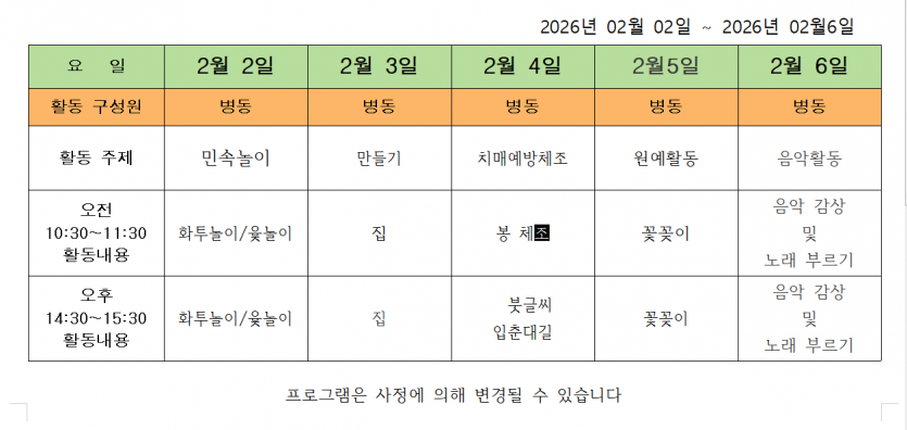 2026.02.04 ( 2월 1주 차 주간 프로그램 ) 페이지 정보 작성자 사회복지사 댓글 0건 조회 44회 작성일 26-02-05 14:20 목록 본문 2026.02.04 이전글2월 2주 차 주간 프로그램 26.02.11 다음글2026.01.15 ( 1월 5주 차 주간 프로그램 ) 26.01.25