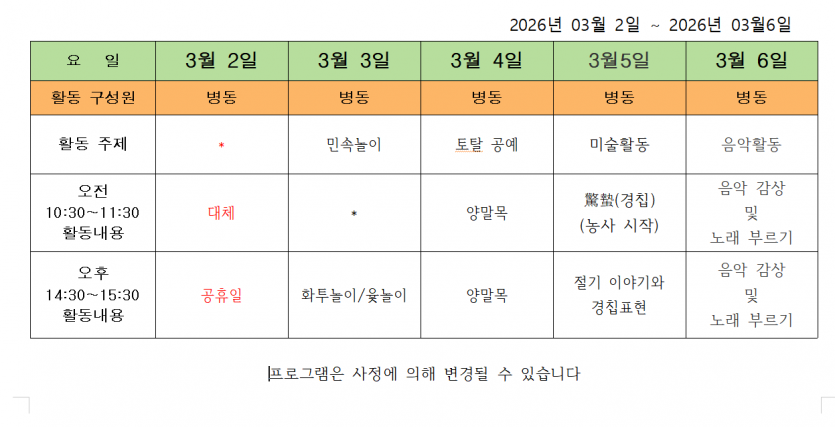 2026.03.03 (3월 1주 차 주간 프로그램) 페이지 정보 작성자 사회복지사 댓글 0건 조회 31회 작성일 26-03-04 09:26 목록 본문 2026.03.03 이전글2026.03.10 ( 3월 2주 차 주간 프로그램 ) 26.03.11 다음글2026.02.24 ( 2월 4주 차 주간 프로그램 ) 26.02.24